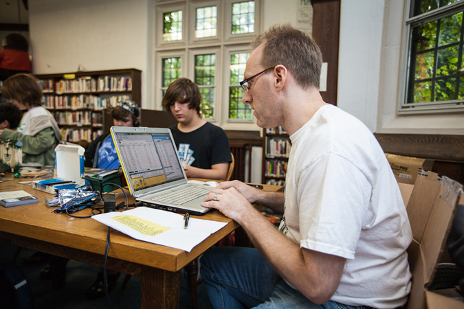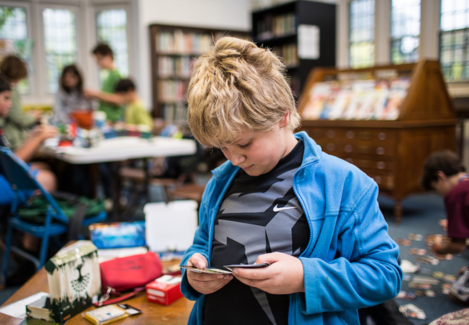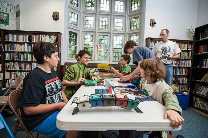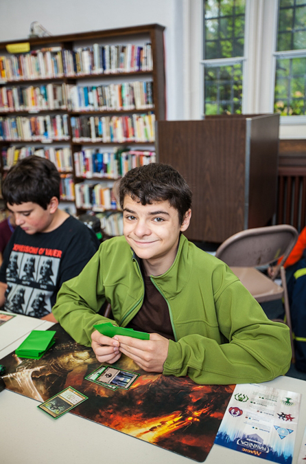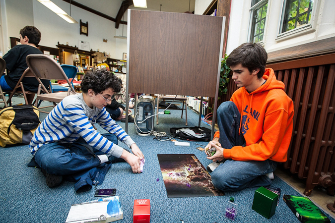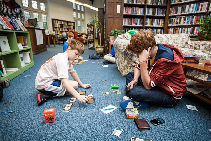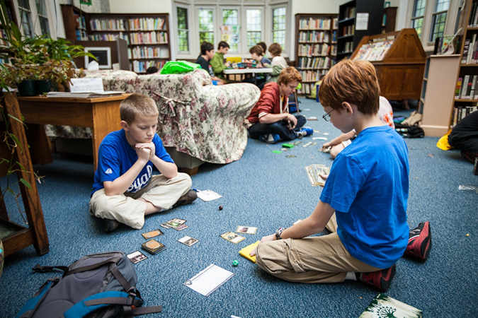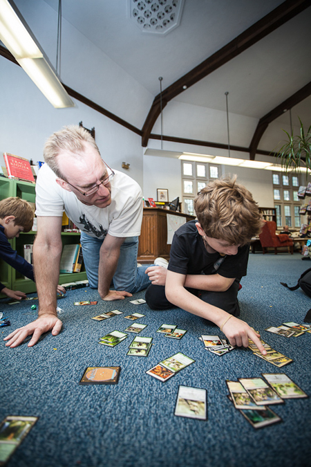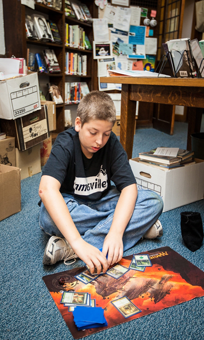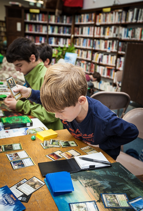 Our tournament filled over half of the library. The floor was soon covered with Magic cards as players built decks, and later, the floor was covered with play mats as players battled through the four-round Prerelease.