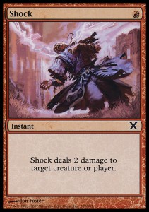 With the release of Lorwyn came Tarfire. Functionally identically to Shock the younger sexier Tarfire filled her spot in goblin decks due to it's tribal status. Then with Magic 2010 came worse news: Lightning Bolt was coming out of retirement. Shock was reduced to back up burn/removal to Lightning Bolt in mono-red. The final nail came with Zendikar and Burst Lightning.