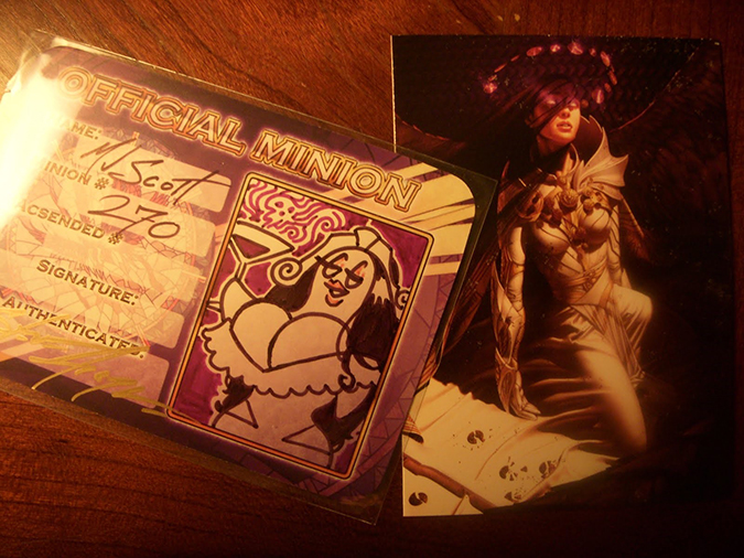 Did you know there’s a way to get free Steve Argyle swag? Did you know that yours truly is an Official Minion and that I got my membership package the other day and it was beyond awesome? Piles of shiny tokens, an Ascended Minion Project sticker, and my personal Minion card complete with a by-request sketch of Liliana plus cocktail—with bonus cheeky and gratuitous fantasy boobage! If you’re not foaming at the mouth already, you will be by the end of this article.