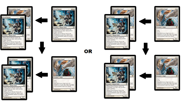 But you also have a way to just put the game out of reach of either of these decks from a stable board state. You have multiple four-card combos that gain you infinite life. Here’s how this works: You need two of either Fiend Hunter or Restoration Angel and one of the other, and you need either Seraph Sanctuary or Trostani. Then, either one of these loops results in infinite life: