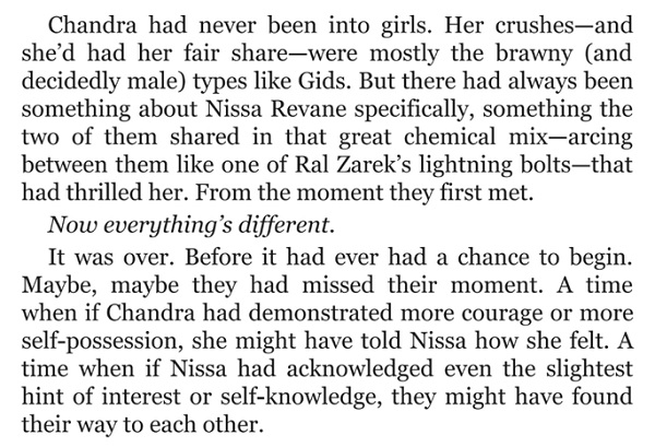 When asked if Chandra and Nissa were in a relationship the question was passed from Mark to the brand manager to the Head of Story and the eventual answer was "read the next book"... ???