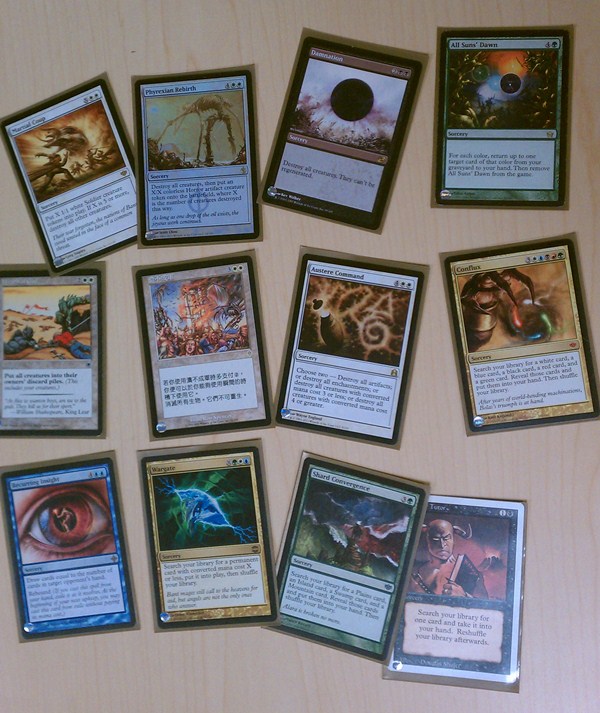 If you’ll recall, one of the themes of this deck is mass creature removal, and I tried not to disappoint. Because they make useful creatures after they do their thing, Martial Coup and Phyrexian Rebirth were absolutely essential. Kirtar's Wrath only makes two 1/1 Birds, so I didn’t deem it to important enough to rock. Rout has the instant potential you love. Damnation and Wrath of God are cheap and prevent the possibility of regeneration. Finally, Austere Command is flexible enough to provide some other useful options while also being a full-on Wrath if you need it.