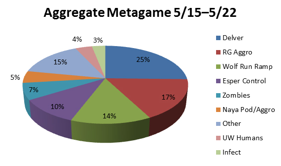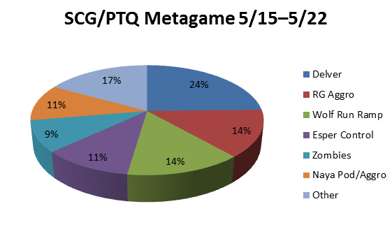 Delver makes up around twenty-five percent of the metagame, R/G aggro and Wolf Run Ramp are around fifteen percent each, and Esper control is around ten percent. As a whole, these have settled to be the core of the metagame. Thus, Delver is clearly the premier deck, with R/G and ramp fighting for second place. Esper control has also clearly proven itself to be the best control deck in the format and a viable option for players who like that sort of thing.