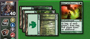 Dropping Rites of Flourishing on his third turn to fuel the entire table was something that I'm sure kept the game from going long. Thanks to his follow-up of Vernal Bloom, I was able to power out a ton of mana (recurring Gaea's Blessing twice to do so) backed up by Nature's Will. That yielded the turn five pictured above.
