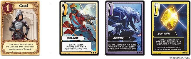 In the case of card effects, I addressed the complexity by drawing parallels between cards, decks, and even between Love Letter versions. Wherever possible, cards of the same number in the hero and Thanos decks have the same effect or serve similar functions. The Infinity Stones are more powerful versions of the non-stones of the same number. Any time an effect from original Love Letter appears, it is at the same number as in the original game. So, a "1" in the hero deck has the same effect as in the Thanos deck, the "1" Stone is a better version of that effect, and they all trace back to the "1" effect (the Guard) from Love Letter. This approach allowed for a cohesive core that would give you an idea of what to expect from a card and build on your expectations if you were coming from the original game. Of course, this couldn't be true of every card, but that familiarity made the other differences easier to handle.