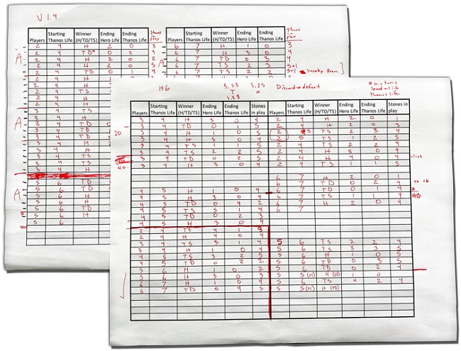 One of the biggest challenges I faced was tweaking the balance without introducing additional complexity. In a heavier game, it can be easier to vary setup steps or add new pieces to solve scaling issues. At one point, I tried a version that scaled the number of Outrider cards in the Thanos deck to the number of heroes. This did a decent job of maintaining balance, but wasn't as "plug and play" as the game needed to be. I wanted you to be able to shuffle the deck, draw starting hands, and play. With that goal in mind, I dug back into play-testing, making minor tweaks back and forth and generally driving my testers crazy. Eventually a combination of scaling Thanos's life and adding one more Outrider to the Thanos deck (at all player counts) got us to the right balance.