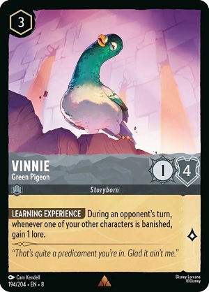 Even though it's not played much this way Steel has numbers that would lend to an Aggro strategy. While Vinnie only quests for one he can serve as board wipe protection. It's not hard to see a scenario where you have 5 characters with 16 lore and your opponent may have Be Prepared ready for the next turn. Here, you can play Vinnie and laugh. Be Prep? You win. Don't Be Prep? You win.