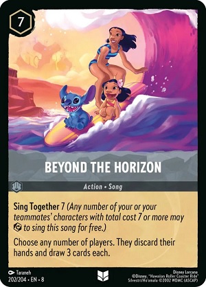 This card feels like the Rotational replacement for A Whole New World. It costs a bit more but can be sung together. While not as powerful because of the reset value being 3 cards instead of 7 it does have the benefit of choosing the players. So, if you have 1 card in hand and your opponent has 6 choose both, if you have 6 in hand and your opponent has 7 choose just them. If it isn't yielding card advantage don't play it yet.