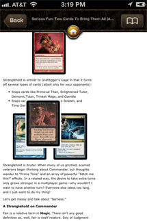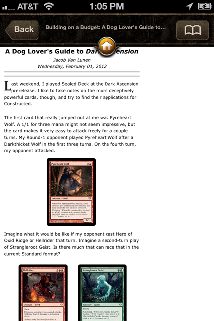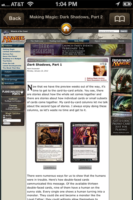 Finally, if you tap a link to a previous article (for example, reading this week’s Making Magic and tapping on the link to last week’s [Part 1 of the Dark Ascension overview]), you are taken to a view of the article on the DailyMTG site. At least it stays in the app.