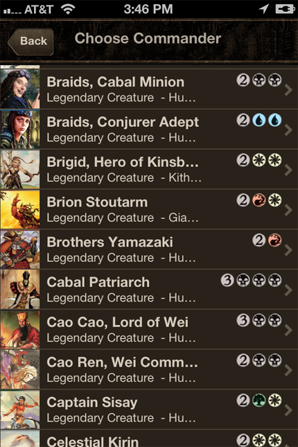 Overall, this is fairly good. One flaw is the Commander list. When you ask to choose a player’s Commander, you are presented a full alphabetical list of all legendary creatures. No search. No alphabetic index on the right-hand side. It’s a big list to scroll though (notice the size of the scroll thumb). This seems to be a theme. Once more: mostly annoying, but not a serious flaw. That said, Zur the Enchanter is a hell of a commander. One other thing: There’s no enforcement of the banned Commander list, and I could happily set my commander to Braids, Cabal Minion.