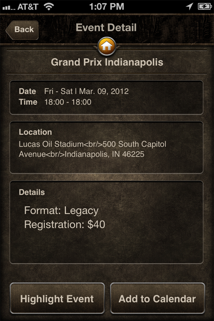 This has so much potential. Your device most likely knows where you are and has Google Maps integration built in. I figured this would pull up a map, flag nearby shops and events, let you enter a different location (e.g., if you’re traveling and want to find an FNM where you’ll be staying), and let you pull up information on the shops/venues.
