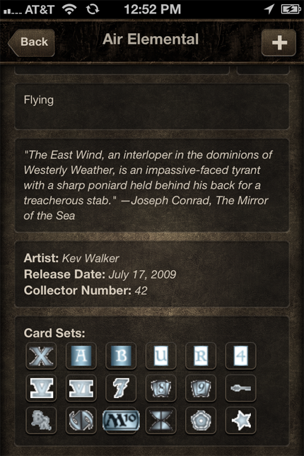 This is currently far from being "The One App" that you need as a Magic player. It's a good life tracker, but the card-browsing and deck-building aspects verge on being laughable. The article reader is a poor attempt at slamming web content onto a mobile device, and the store locator looks to be an eleventh-hour addition in an attempt to fill in the home screen. I'll stick with Decked for deck-building tools, Gatherer for card browsing (or maybe finish my card reference app), MagicTheGathering.com for reading DailyMTG, and MTGMom.com for event info.