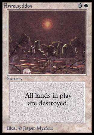 Anyone can destroy creatures. It takes a true master of grief to want to destroy the entirety of both player's mana sources. Are you about to lose with ten minutes left on the game clock? Fire off one of these and force the game into a tie. Your opponent will be so aggravated at the near-win that he'll barely be able to concentrate on the tie-breaking final game. This card is especially effective in long-form multiplayer formats such as EDH. Twenty turns and 1.5 hours of whiddling down your opponent to 10 life or so and Ka-Boom! We're starting this one over, Chikoritas! Your opponents will be so miserable that they'll barely want to play Magic the Gathering ever again let alone finish this abomination of a game.