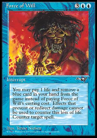 Green and red wizards are frustrated individuals by their very nature. They lack the cognitive capacity to understand what's truly going on around them and thus, end up channeling that frustration in the form of impulsive behavior, brash decision making and loud, smelly bodily functions. But nothing seems to dishearten the furry beasts more than a nice, clean counter. And Force of Will just so happens to be the most powerful of all. Imagine a green wizard who has somehow managed to hold back on casting his Primeval Titan for several turns, patiently waiting for you to tap out and/or run out of counters. Finally, he sees that you've tapped out and plays the creature spell. Unfortunately for him, he is going to be doing nothing again this turn because FoW costs only one life and a discarded blue card to cast. Sorry big daddy... you're going to have to wait until next game to play a spell. Another mindless animal kept safely in the zoo where he belongs.