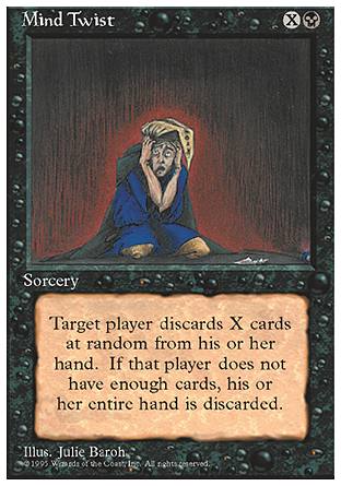 No phrase has caused more Turn Two grief than that of "discards X cards at random". Play this card as early as possible to make sure you have a chance at discarding one of their crucial lands. You can even Dark Ritual your Mind Twist on turn one or two for an effective, frustrating mana-screw that your opponent will have nightmares about for the rest of their miserable life. Has you opponent already mulliganed down to six cards with two or three lands? Hopefully you're going first and can rid him of one or two of those on turn two! Similar to Hymn to Tourach but with the added bonus of being more effective mid-game, Mind Twist is sure to cause your opponent's soul to tear.