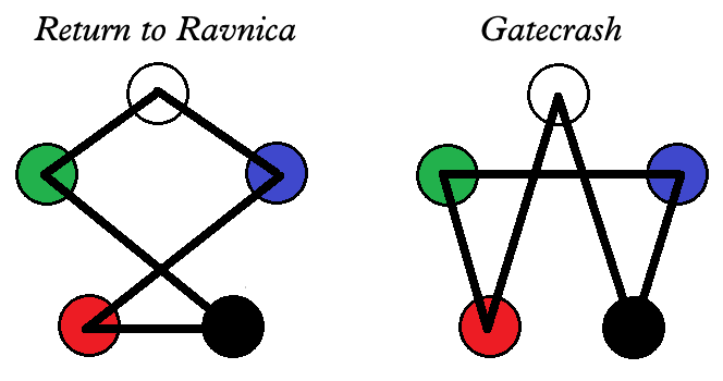 Let’s take a minute to look at the way the guilds were divided up. Both Return to Ravnica and Gatecrash include a combination of allied and enemy pairs, and both have an even color spread, with two guilds containing each color. I had to sketch it out before I really understood how it fit together.