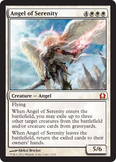 While Angel of Serenity’s versatility is its strongest attribute, I suspect I will most often be targeting some combination of my opponent’s creatures in play and creature cards in my graveyard. This combination gives you some Oblivion Ring–style removal that refunds you creatures of your own even if it’s destroyed. I hear generating tempo and card advantage at the same time is pretty good.