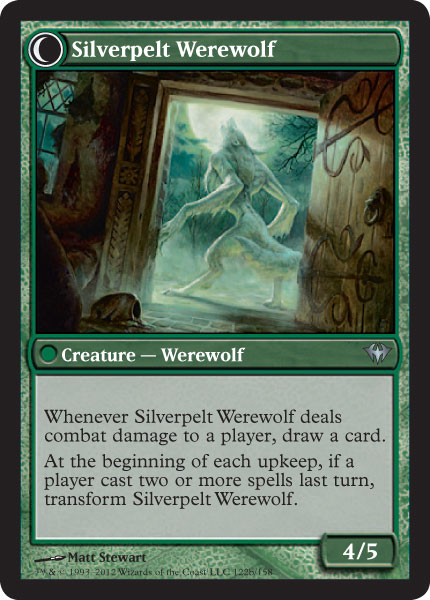 Obviously, Silverpelt Werewolf isn’t exactly what one would call “the stones” in Constructed, but it’s going to really shine in Limited, following in the footsteps of Ohran Viper. Any time something green gets to draw cards, that card will be a very high pick. Getting to attach a 4/5 to that ability is icing on the cake.