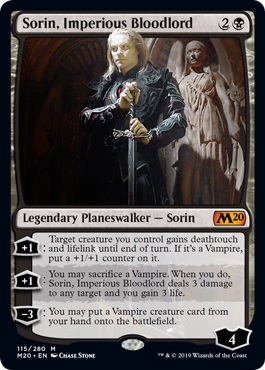As you'll have no doubt noticed, this Sorin, unlike any Sorin previous, is far more vampire-centric than the others. While the other Sorins would often make Vampire tokens, this one relies on you already having Vampires to be in full effect. That being said, all of the abilities are pretty good if you do indeed have the vampires, and at three mana, this Soin is making a run at other popular three-mana planeswalkers, such as Jace Beleren, Liliana of the Veil, Liliana, the Last Hope, and, well...any three-mana planeswalker from War of the Spark that you can think of basically. (No, seriously, pick one, they're all bonkers.) Another thing Sorin has going for him is that he starts at an impressive four loyalty, and has two +1 abilities to tick up to five immediately.