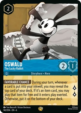 I think Oswald here is the best Sapphire card this set. Oswald let's you look at the top card of your deck whenever a card is put into your inkwell, and if that card is an item card, play it for free. Yes, play it for free. Even a 7 cost Lucky Dime could be played for free. The fact that Oswald is only 2 cost and can quest for 2 makes it to where you can play him pretty early and start accruing value off his ability real early into the game. The one downside is this card can be removed easily. I just think the ability to cycle through your deck and play items for free gives this card a lot of value. Expect this legendary card to be one of the more expensive cards of the set.