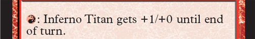 On second thought, forget about Constructed and let’s concentrate on where the Inferno Titan really shines – Limited. Drop this bomb on your opponent, and that about wraps up the game. Not only do you get a Shivan Dragon-level beater, it removes those pesky blockers (or evasive attackers) every turn until it is dealt with, or you win. Inferno Titan is the best thing a creature can be in MTG, a threat that must be answered. There may be a question regarding why this card is any better than the Lorwyn elemental Hostility. The answer is simple: IT is perfectly self-contained.