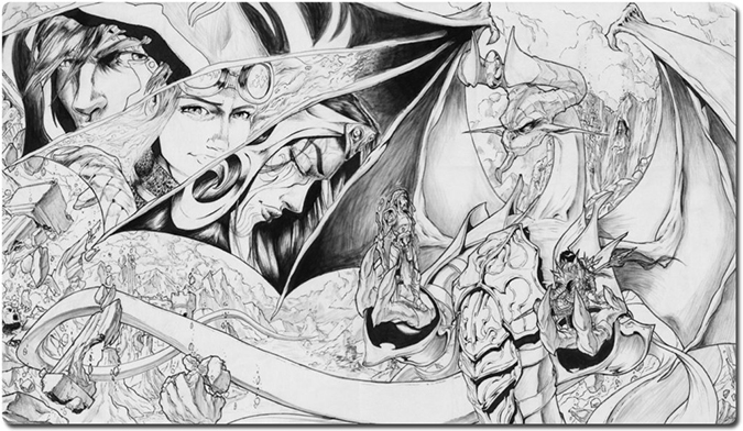 Eventually, Trick (from the days when this was still ManaNation.com) gave me the chance to run a weekly web comic, which I hope most people have forgotten about by now. It was painstaking because I could only work on it during the evenings after work, which didn’t leave a lot of time for sleep, but the practice paid off in dividends. Eventually, I was given a chance to produce a piece of art for HCD Supplies, and I have since become more and more involved in illustration. My full-time job now is with Grey Fox Games (though I still lend a hand here and there at CoolStuffInc.com), and I also handle some of the duties over at HCD Supplies.