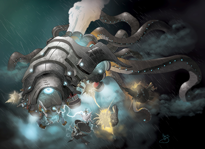 AG: Like I said, I was originally tasked with creating fantasy-based art for the game. Eventually, I considered adding a western/steampunk element to the classic fantasy tropes. You’d have the fairy character spiking the beer at the local saloon and a kobold leading an expedition down an old mine shaft. I had even envisioned the dragon being made up of old steam engines coming out of a ravine, with the flavor being that after a number of trains had been accidentally plunged into its depths, something mysterious would result from it. Maybe the spirits of the dead haunting the ravine would reanimate the wrecked trains to seek vengeance or something along those lines. (I may have to illustrate that for fun at some point anyway.)