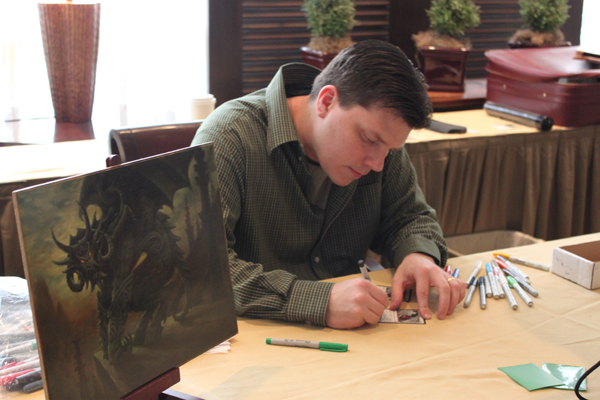 Matt’s not just a fantastic artist but a super nice guy. He signs cards with a little thought behind the signature color, his most prominent trademark a matching green and red John Hancock laid on Rootbound Crag. He was set up sharing his time and craft Friday evening while the grinders were firing. He collected playmats, proofs, and other objects to be sketched upon so that he could finish them all during the night, after his time in the booth concluded.