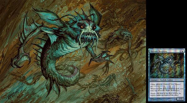 Tom is a pretty prolific artist when it comes to Magic. He has over a hundred artworks, and well, we have an exclusive on GatheringMagic for him. If you mention that you heard of his paintings from “Vorthos Wednesday,” he'll offer either of these pieces for $200 from now until December 31. I like both pieces—they're great in different ways. The Mantle has amazing figural work with a lot of movement, and the Reejerey is a merfolk lord . . . Does it need more appeal than that? Yes? It's 15” x 11”! That's an oversized Magic card art painting.