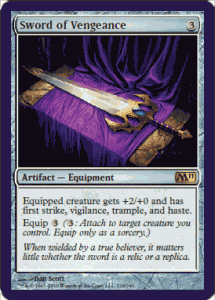 Artifact - Equipment Equipped creature gets +2/+0 and has first strike, vigilance, trample and haste.