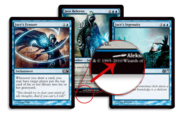 It would seem that all five original Lorwyn planeswalkers will be returning, so no Jace, the Mind Sculptor in Magic 2011, nor with a new form for Liliana. How do we know? Look at the graphic below, pulled from MaRo's article today. Note the copyright dates on the bottom of Jace Beleren.