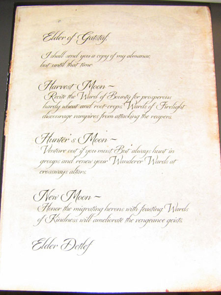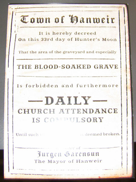 He has given me the name of a village; Hanwier. After (2? a?) long journey, and a short battle with a band of brigands, I arrived this night to the shuttering of windows and closing of doors. Whether this place is cursed as its inhabitants believe remains to be seen. The curse of mistrust is flourishing however.