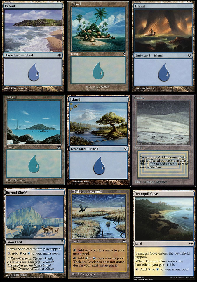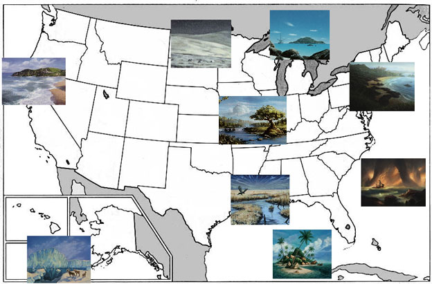 I struggled with choosing a political way to showcase nearly the entire country via land selections. There are no mountains across the counties, but there are always islands and plains from coast to coast. I tried to divide the country by region and find representative lands from Magic’s history.