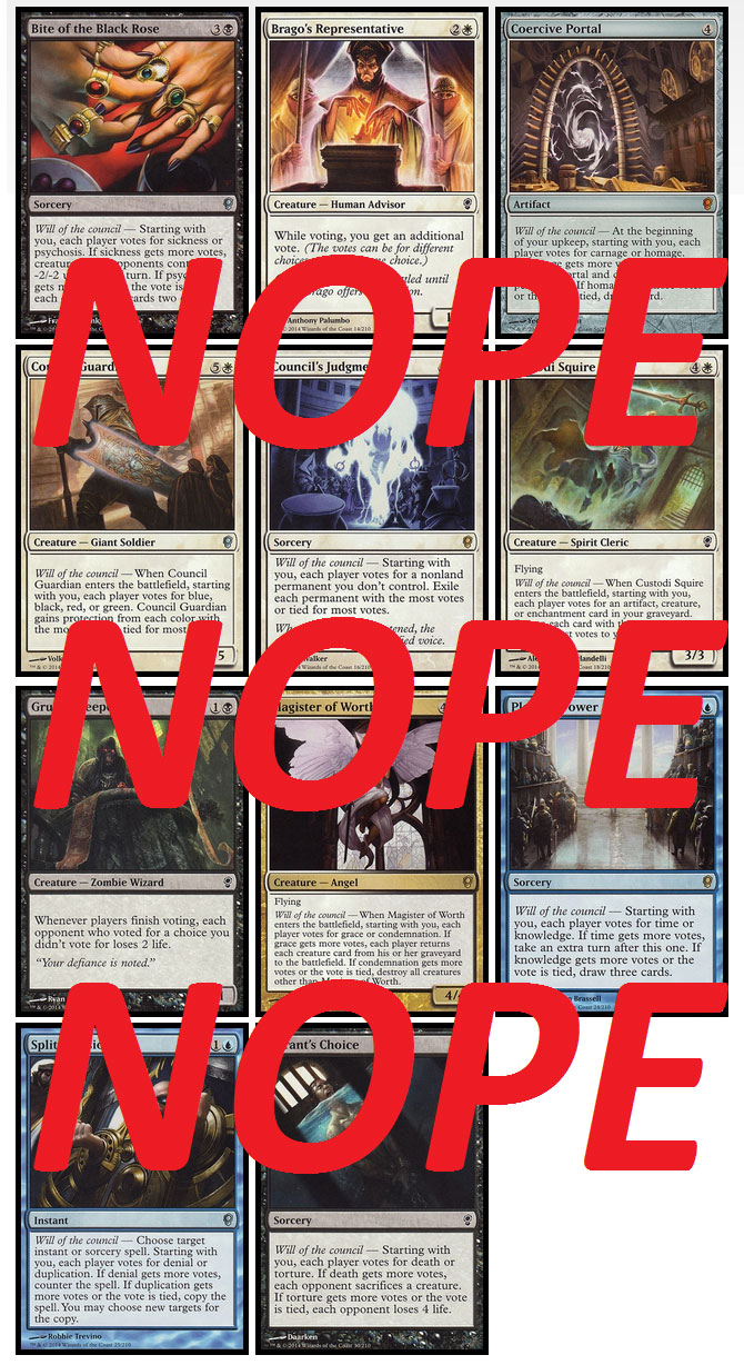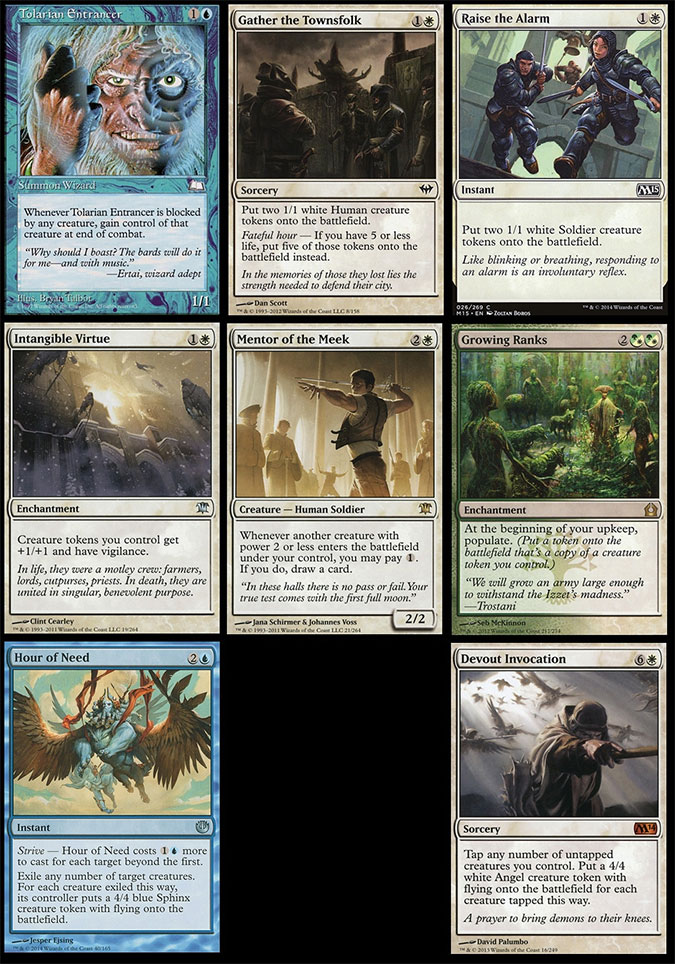 All that said, the deck is really cool. Giving you the benefit of as much doubt as I can muster, I'd say that you interpreted Entrancer's flavor text not as vanity or pride, but rather a testament to his loyal following. And maybe Entrancer's ability is not about Control Magic or Mind Control, but rather about winning over the support of his opponents. Is it about him bringing them to his side? Am I getting somewhere here? Can you please explain your reasoning next time? As is, I have to squint a lot to transform the gritty-toothed, mind-warping Entrancer into the "Selesnya Sanders" character you've painted.