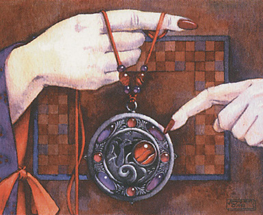 This is a famous painting on Dominaria, and it has been replicated many times over the years. This particular piece is the fourth iteration—the earliest I was able to acquire, and perhaps the earliest that still survives. The amulet depicted is known as an Amulet of Kroog.
