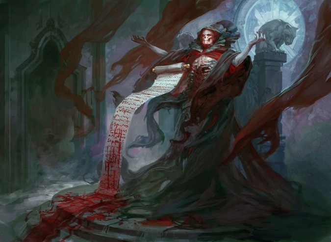 When Elbrus becomes Withengar, it first abandons (unattaches from) its pawn. Then the actual card changes types, revealing the color identity it had all along. The liberated demon—his power and toughness set with Innistrad’s numerology—is triply persistent at pushing his vengeance through. He swells with player death, a trigger-drama I can only find on Blood Tyrant, which expresses hunger for only the most brutal.