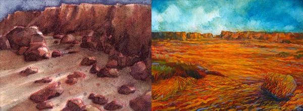 Even when working from photo references, students are forced to record only the most basic information, shape and color, at a minute level. What they are left with is a very Drew Tucker–esque result, the real core of the image, the elements that made that image interesting in the first place, unburdened by the details of the original. The student has the kernel, that nugget of his or her own personal truth, that he or she is free to use and repurpose. This keeps the story purely as it was intended, art in its raw form.