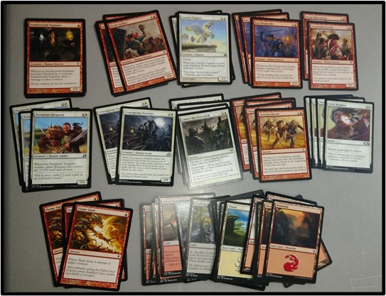 Jason has been a mainstay of the club since our first meeting this year. He came to us with some precon decks (they even had sleeves!) and had a strong grasp of most of the game's basic mechanics. He had fun with a Mono-Blue merfolk list I had lying around, and requested that I build him a merfolk deck. I agreed, but it's taken me longer than expected. So, to help with the wait, I gave him a choice between three other decks that I had already completed. He chose Boros Humans.