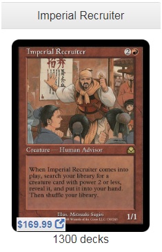 Sometimes a card is very, very expensive because it's very good, sometimes it's because it's very rare and sometimes it's both. You don't need the basics of supply and demand explained to you -- you intuit how those factors drive up the price of a card. However, what's not always obvious is the effect of tweaking one of the factors. You can't always predict the ending price of a card unless you compare it to something very similar both in terms of supply and demand that got a similar amount of new copies in a reprinting. I want to talk about a card that is indeed very good but which I think is inflated in price a bit due to its scarcity (and its being played as a multiple-of in Legacy) having been printed in a Portal set that didn't sell very well. I want to talk about Imperial Recruiter and how it's suddenly kind of reasonable for you to own one. If you want a more in-depth explanation of where I and other financiers think the price will end up, first cratering at peak supply and later equilibrating as copies get taken out of the market and put in decks, check out this week's Brainstorm Brewery podcast which will be out tomorrow on Youtube and podcast apps. If you don't care, I don't blame you. For the purposes of this article, let's suffice it to say that the price will go down, and if you wanted an Imperial Recruiter but couldn't justify paying nearly $200 for one, you're about to get a chance to own one or even several for much more reasonable a price.