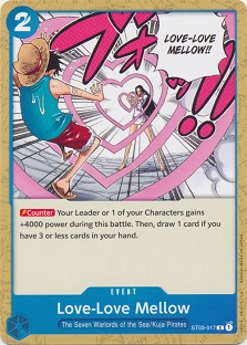 These cards add consistency and card drawing and reduce your hand size for cards like Death Wink and Love-Love Mellow, which trigger and draw extra cards. If you're playing against another Nami player or a deck that doesn't expect you to swing, Usopp is a surprise that can help you mill seven cards off the top. However, in a blocker situation, he's next to useless since he doesn't even have any counter.