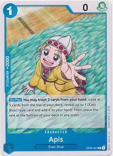 Immediately, you can tell that there's a synergy with a few of the Nami core cards. Nami (050), Kaya, Usopp's Rubber Band of Doom, Sanji's Pilaf, and Gum-Gum Giant Gavel are all East Blue cards. Naturally, it makes sense to drop a searcher in there. The East Blue package is the one most people play in Nami competitively. Here's a sample list: