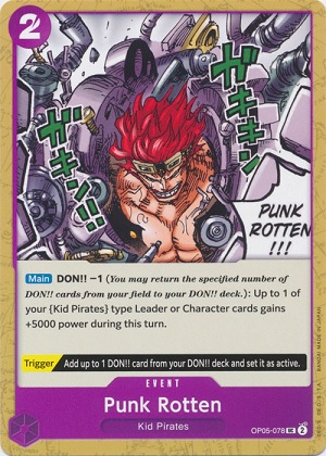 OP05-078 Punk Rotten is an underrated card for several reasons, not least of all the fact that it gives your leader +5k power on a turn. Without added Don!!, that puts the first Kid swing at 12k, and the second at 14k. It's a Build Your Own Gol.D.Roger. Speaking of which, we can also include that in this deck. At the time Roger comes down either you or your opponent should be low on life making it a free swing for life.