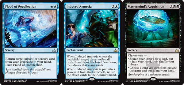 Induced Amnesia shows Jace removing Vraska's memories of Jace on Ixalan. He's done that sort of thing a bunch in the past, usually to save someone's life, and this time is no different. It's something Vraska has consented to, and the mechanics of the card seem to imply the memories of their time together could come back. The exact details are again left vague, will Vraska act as a sort of undercover spy for the Gatewatch?