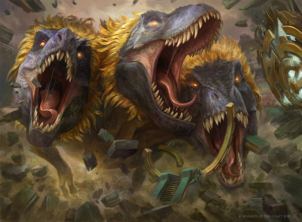 While all the elder dinosaurs are cool, I want to focus in on the outlier, Zacama, Primal Calamity. Zacama shows up on three different pieces of art: his own, Shake the Foundations, and Huatli, Radiant Champion. Zacama is interesting for a few reasons. There is the obvious Kaiju inspiration, so much so that even the most casual of observer can't help but notice it. This is a giant monster in the vein of Godzilla and his chief antagonist, King Ghidora. Especially the three-headed, golden King Ghidora. There's no way anyone involved in creating Zacama didn't know what they were doing.