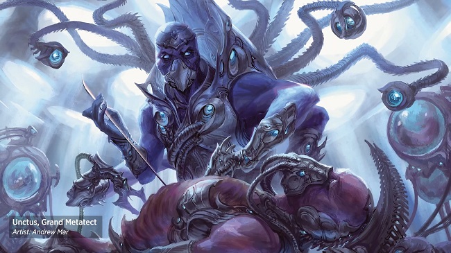 Unctus, Grand Metatect is a side character from the Scars of Mirrodin block. He was originally a Vedalken researcher named Kiryk who became one of the first infected. The story Unctus of the Synod was on one of the Scars of Mirrodin 'minisites', which were these flavor websites created for set releases in the 2000's and early 2010's. The card is also a reference to Grand Architect.