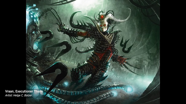 Also known as the Thane of Blood, here's what the Planeswalker's Guide to New Phyrexia: The Steel Thanes has to say about Vraan: