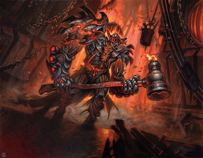 Slobad is one of the protagonists of the original Mirrodin block. Born under the blue sun, he was thought to be a bad omen and abandoned. He was adopted by the chief of the exiled Krark clan, but eventually left for a life of solitude because he was ostracized for being too smart. He hid in the repair bay for Memnarch's Levelers, which is how he met Glissa. They became inseparable friends, and Slobad's outlook on life changed. He also rebuilt to the golem Bosh, who later died saving their lives. Eventually, through a convoluted series of events, all the souls on the plane, include Glissa's with her unignited planeswalker spark, flowed into Slobad. Rather than leaving the plane as a near-god, he chose to put the souls back and bring back his friends.