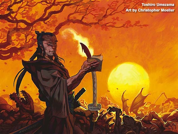 Toshiro did pretty well for himself, founding a clan that would last four hundred years. His descendant, Tetsuo Umezawa, would change all that. By this time, Madara was ruled by Nicol Bolas, Planeswalker as god-emperor. Tetsuo was the Imperial Champion, one of the three branches of Bolas's government, including his Imperial Assassin, Ramses Overdark, and the military. The Champion's duty was to uphold the Emperor's honor, and so when Tetsuo deemed Overdark's plan to quell an island chain in rebellion dishonorable, he made a move against the Imperial Assassin. Bolas, of course, is not all that interested in his honor, so when Overdark makes the case to consolidate power within himself, Bolas grants the plea.