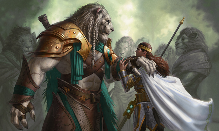 Ajani arrives in the midst of this, reconnecting with his old friend Brimaz, King of Oreskos and seeking out Elspeth with his fellow leonin. Together, Ajani and Elspeth are able to find a way into Nyx to deal with Xenagos, but first Elspeth is required to complete an ordeal. She chooses one from Erebos, God of the Dead, asking the god to revive her love Daxos. In the god realm of Nyx, the pair confront Xenagos, God of Revels, and Elspeth slays him with Godsend.
