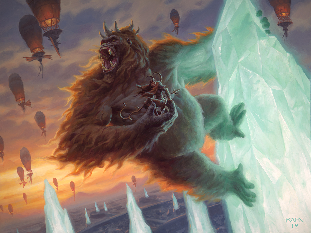 Kogla, the Titan Ape is our big, obvious King Kong reference. The art perfectly captures Kong's classic "Empire State Building" imagery, while updating it to use the Argalith from Drannith.